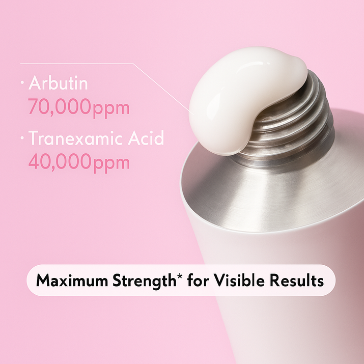 Answer 1: The cream contains 70,000 ppm Arbutin and 40,000 ppm Tranexamic Acid, which work together to visibly brighten and even out skin tone by reducing dark spots and discoloration. Additionally, Niacinamide refines skin texture and reduces pore size, while Glutathione provides antioxidant protection for a glowing complexion.
